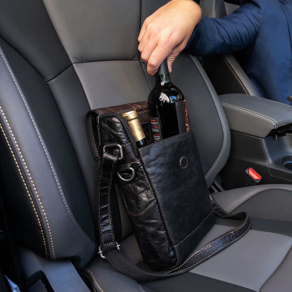 This bag is a cross body messenger and a wine bottle carrier in one. As a wine bag, it offers a sophisticated way of transporting your favorite wines for a dinner engagement or special event. It has space for two bottles, keeping them safe and secure inside. Or you can choose to carry a single bottle of wine and two glasses. Open pockets on the gussets are the perfect place to put a corkscrew, drip ring, or bottle stopper. The inside of the bag has a padded divider to keep the bottles separated but conveniently folds away so that the bag can be used as a fully functional cross bodymessenger. The padded interior will hold your tablet, notepad, and accessories. Flap closure with zip down sides make it easy to open and close. Whether you use the bag to carry wine or as a cross body, you will enjoy the added flexibility that it offers. This hand made leather bag features: